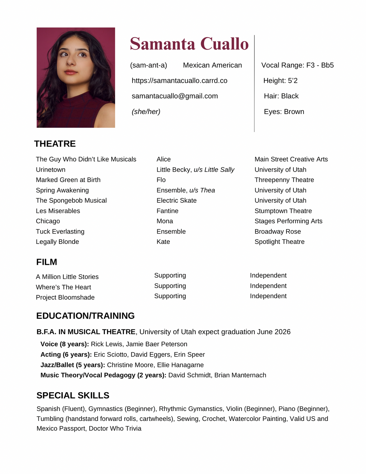 Hey everyone! I’m Samanta Cuallo, but all my friends call me Sammy! I am a Mexican-American actress currently completing my BFA in Musical Theatre this May at the University of Utah (Salt Lake City). I love theatre's ability to bring people together and I can’t wait to get out there and bring that connection to other communities!I am currently local to Phoenix, Arizona but grew up in Portland, Oregon and New Jersey and I consider both home. I was first introduced to the world of live performance when my parents enrolled me in violin lessons at five years old, and I fell in love with it ever since. I did it all from rhythmic gymnastics to choir, but once I found musical theatre I knew that was my real passion.As self proclaimed hobby collector I love to branch out from theatre and experiment with as many forms of self expression possible! When not on stage you can usually find me painting something for an art class, finding a new local library to read at, or making clothes! knitting and crocheting for my friends and family is my ultimate love language.